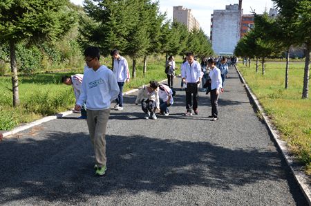 同学们在园区捡拾垃圾