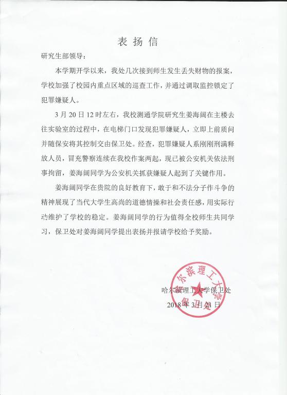 姜海阔同学在贵部的良好教育下,敢于和不法分子作斗争的精神展现了当代大学生高尚的道德情操和社会责任感,用实际行动维护了学校的稳定。姜海阔同学的行为值得全校师生共同学习,保卫处对姜海阔同学提出表扬并报请学校给予奖励。